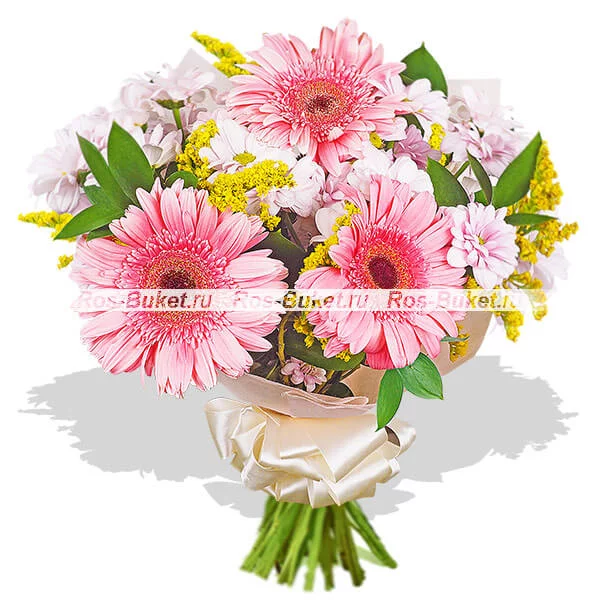 ДЕЛЮКС: гербера розовая - 9 шт, хризантема кустовая светло-розовая - 8 шт, солидаго - 5 шт, фетр бежевый, бант бежевый.