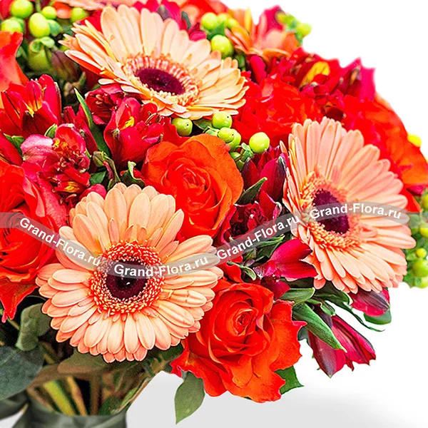 Роза оранжевая - 9 шт., гербера оранжевая - 7 шт., альстромерия бордовая - 5 шт., гиперикум - 5 шт., лента зеленая.